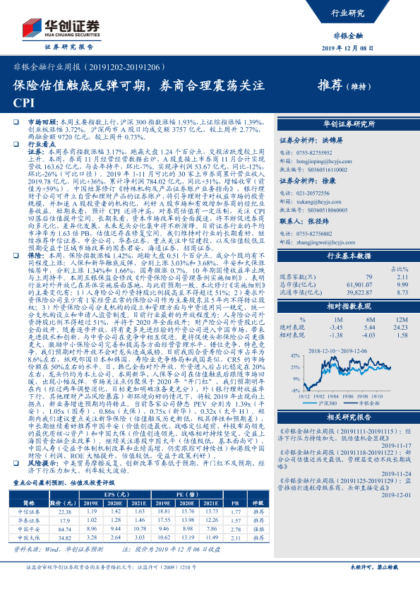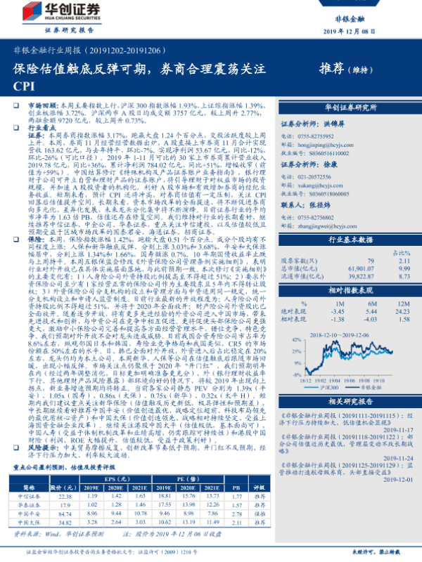 【华创证券】【20191208】非银金融行业周报:保险估值触底反弹可期,券商合理震荡关注CPI-14页