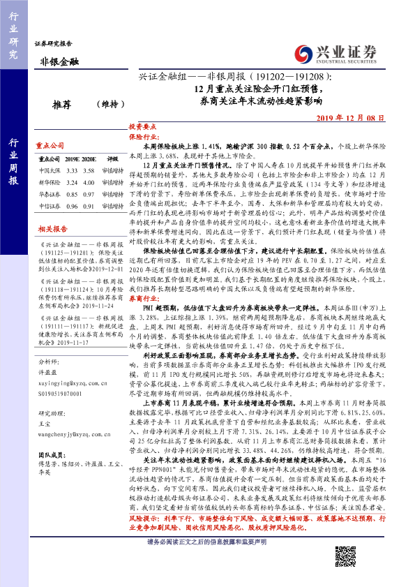 【兴业证券】【20191208】12月重点关注险企开门红预售,券商关注年末流动性趋紧影响-10页