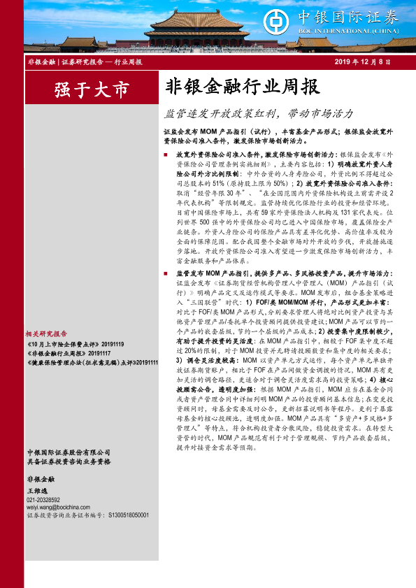 MOM产品 外资保险公司 行业周报 证券研究报告 非银金融