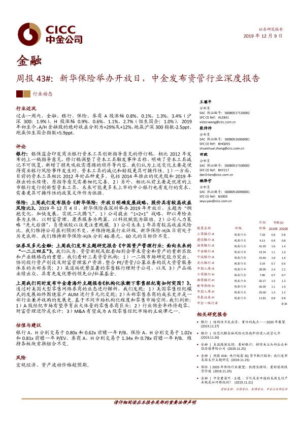 【中金公司】【20191209】金融周报43#:新华保险举办开放日,中金发布资管行业深度报告-14页