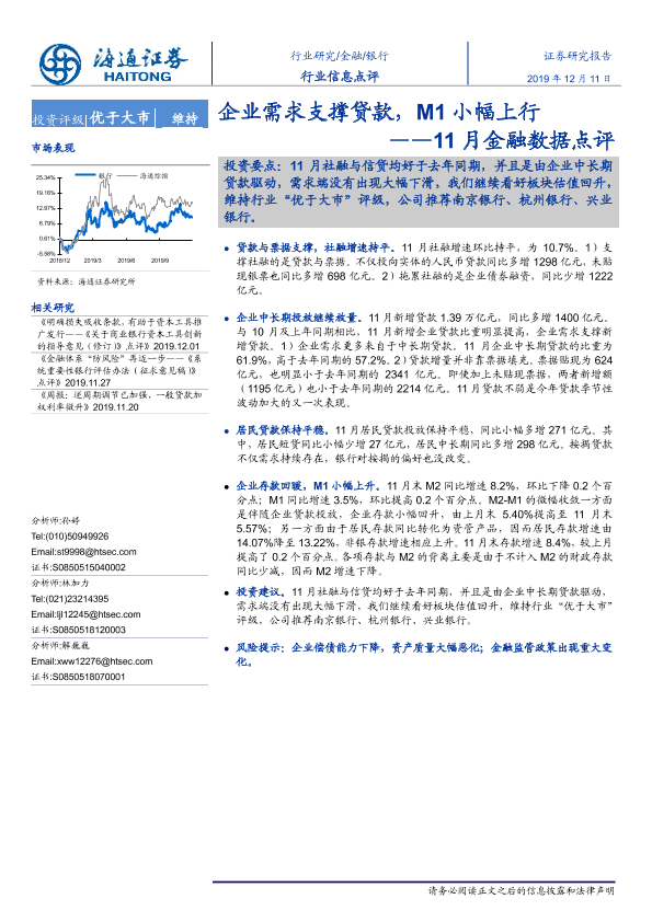 【海通证券】【20191211】11月金融数据点评:企业需求支撑贷款,M1小幅上行-3页