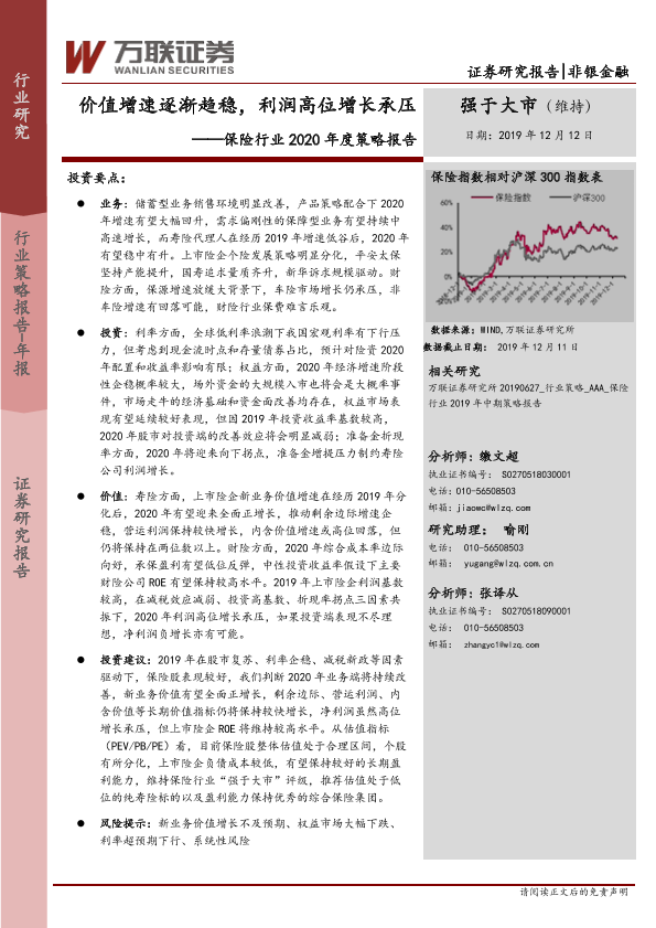 【万联证券】【20191212】保险行业2020年度策略报告:价值增速逐渐趋稳,利润高位增长承压-25页