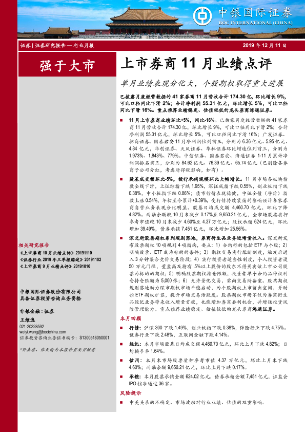 【中银证券】【20191211】上市券商11月业绩点评:单月业绩表现分化大,个股期权取得重大进展-13页