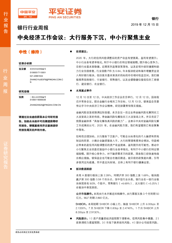 【平安证券】【20191215】银行行业周报:中央经济工作会议:大行服务下沉,中小行聚焦主业-5页