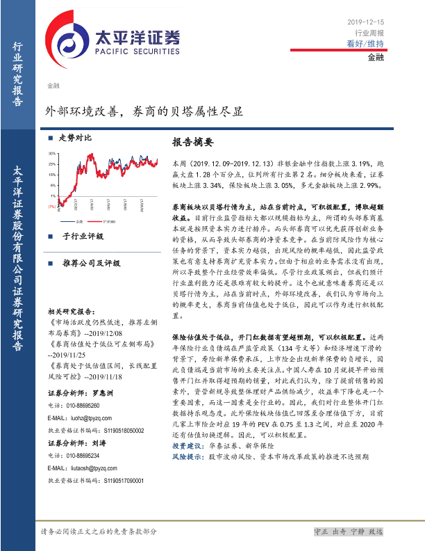 【太平洋证券】【20191215】金融行业周报:外部环境改善,券商的贝塔属性尽显-12页