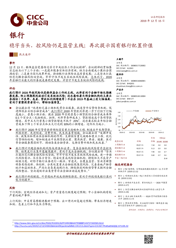 【中金公司】【20191215】银行热点速评:稳字当头,控风险仍是监管主线;再次提示国有银行配置价值-5页