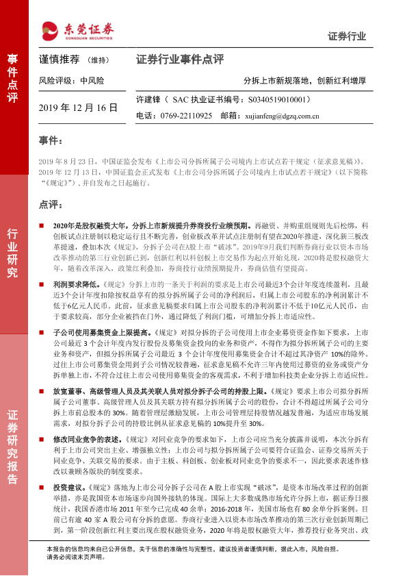 【东莞证券】【20191216】证券行业事件点评:分拆上市新规落地,创新红利增厚-4页