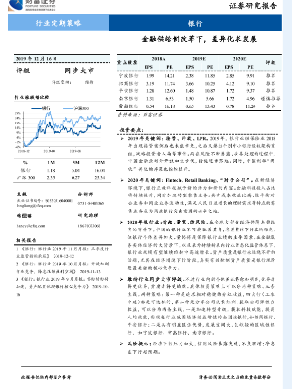 【财信证券】【20191216】银行行业定期策略:金融供给侧改革下,差异化求发展-27页