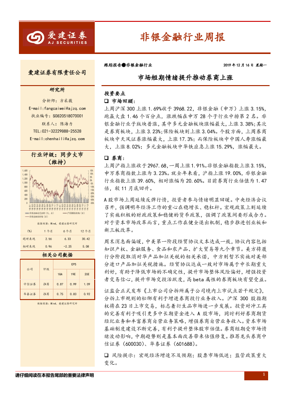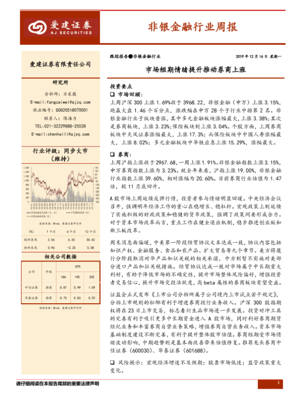 【爱建证券】【20191216】非银金融行业周报:市场短期情绪提升推动券商上涨-11页