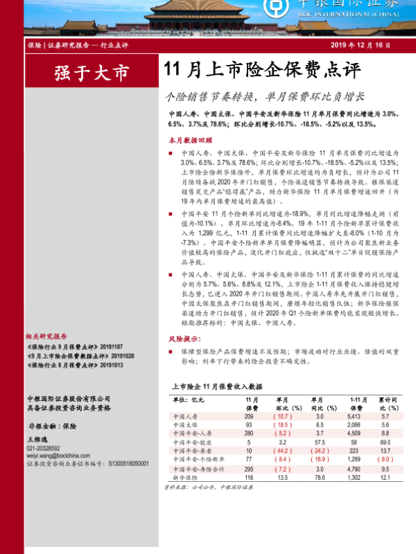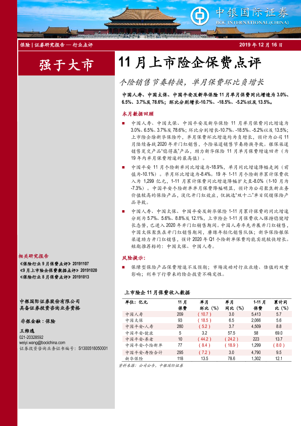 【中银证券】【20191216】11月上市险企保费点评:个险销售节奏转换,单月保费环比负增长-4页