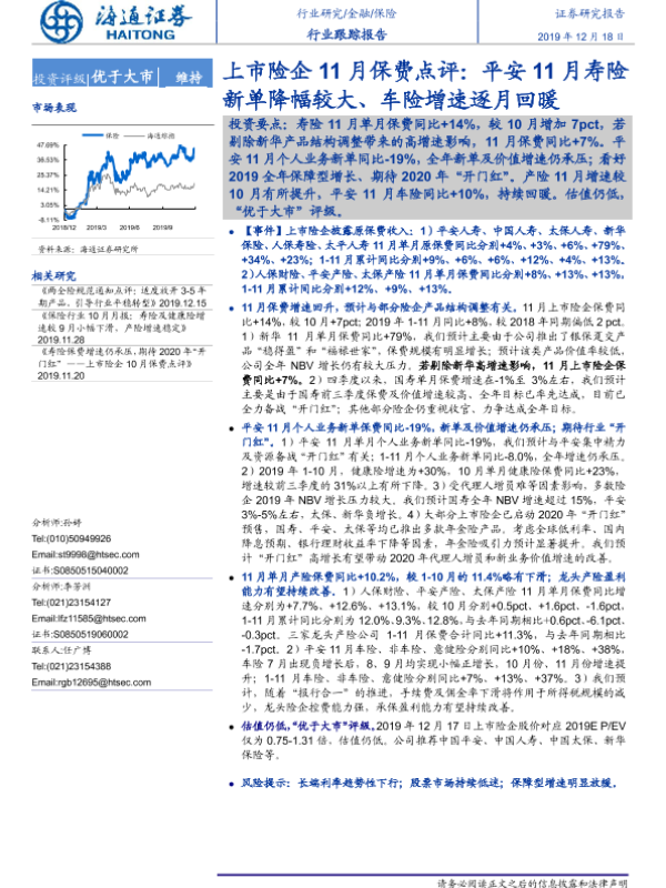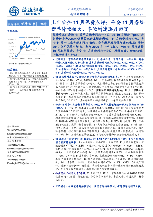 【海通证券】【20191218】上市险企11月保费点评:平安11寿险新单降幅较大、车险增速逐月回暖-6页