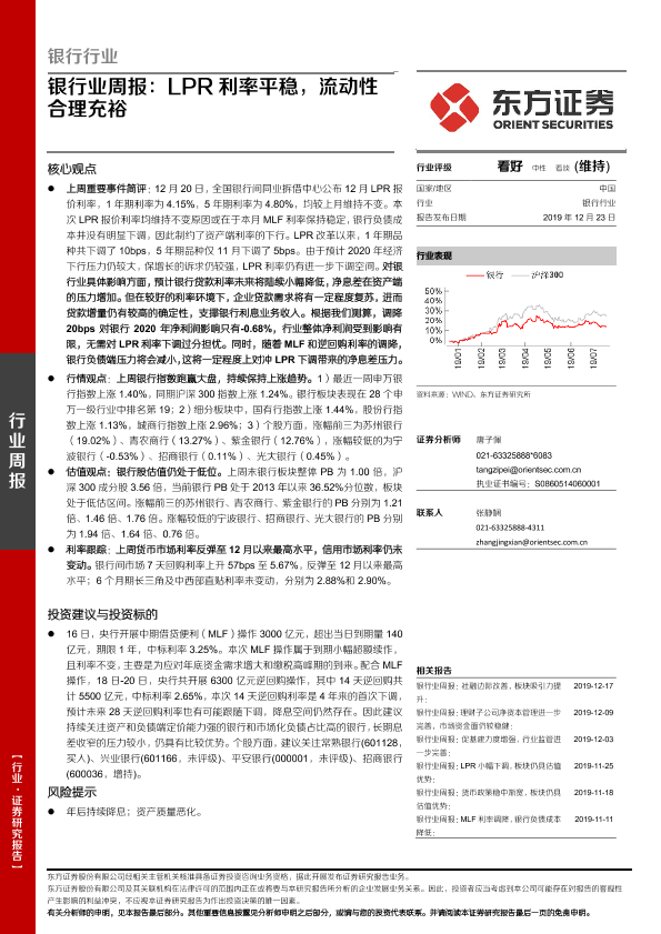 【东方证券】【20191223】银行业周报:LPR利率平稳,流动性合理充裕-13页
