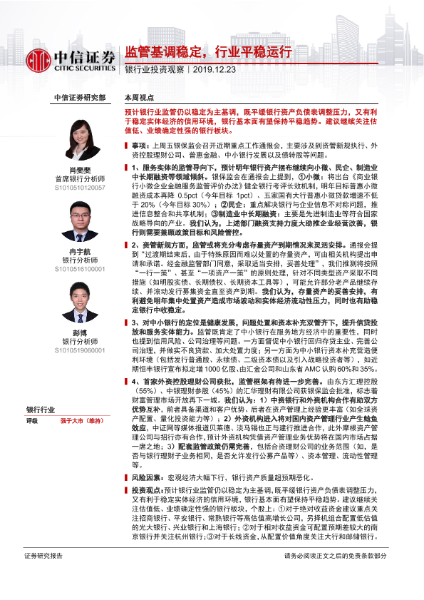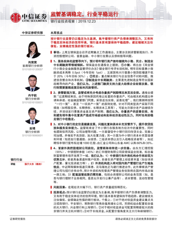 【中信证券】【20191223】银行业投资观察:监管基调稳定,行业平稳运行-10页