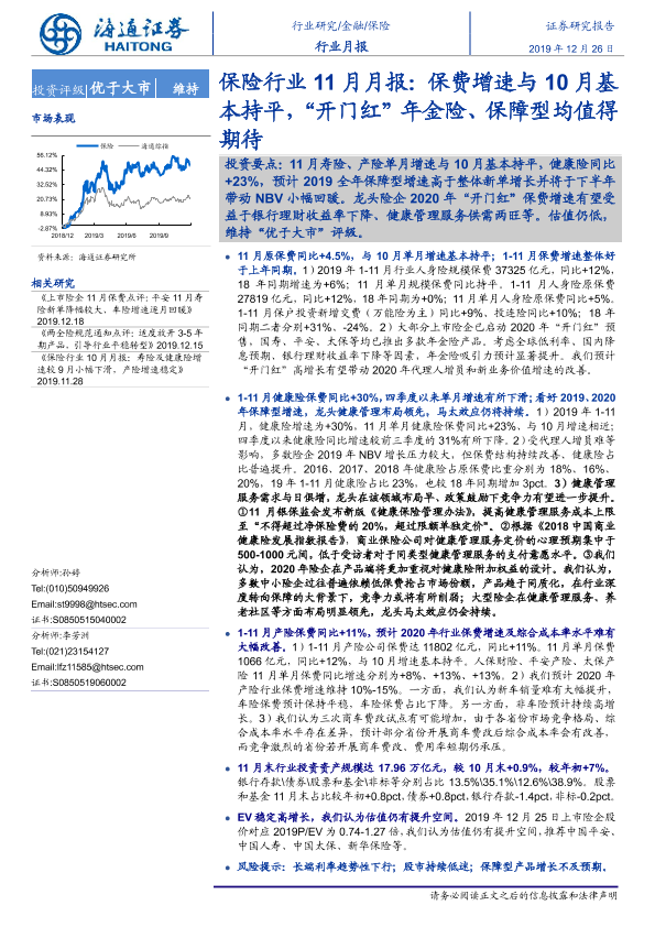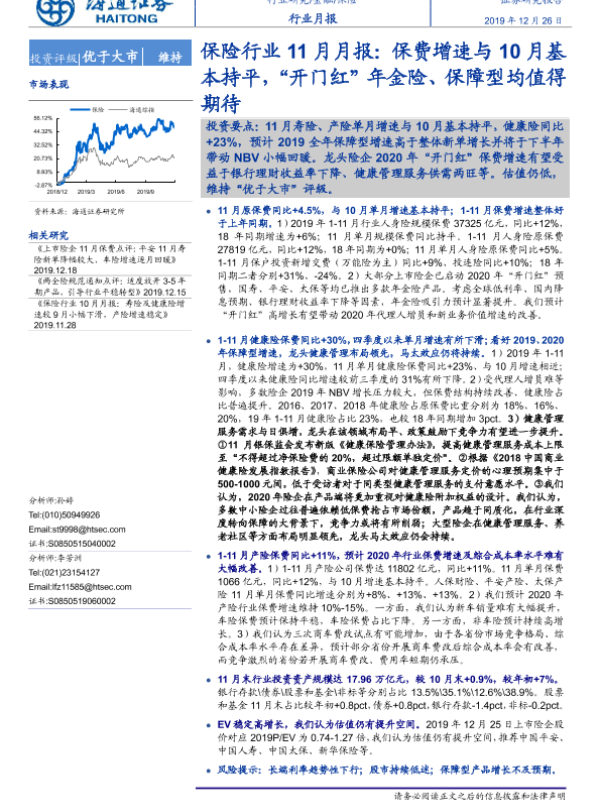 【海通证券】【20191226】保险行业11月月报:保费增速与10月基本持平,“开门红”年金险、保障型均值得期待-6页