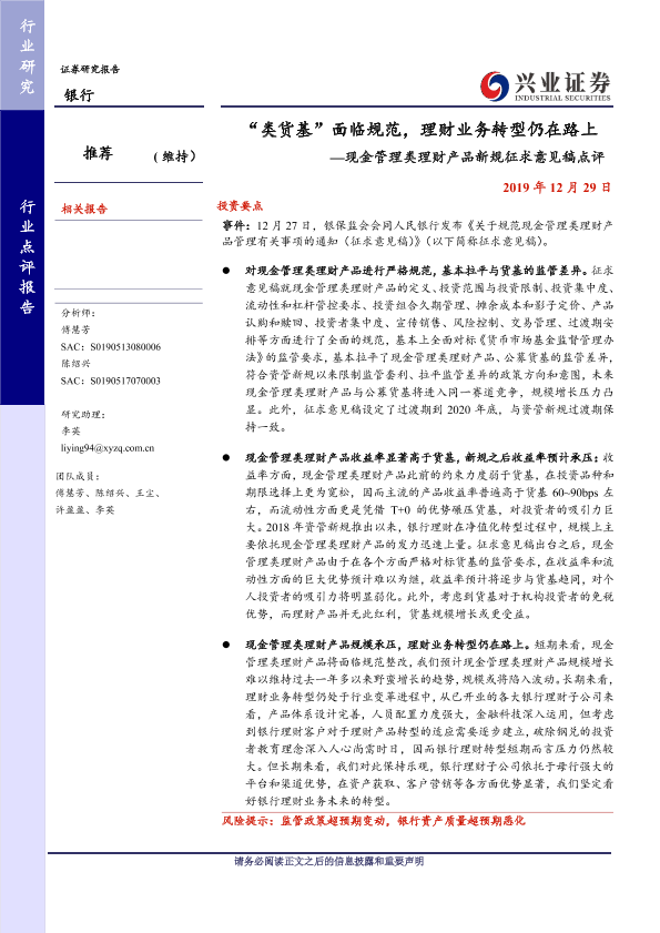 【兴业证券】【20191229】“类货基”面临规范,理财业务转型仍在路上——现金管理类理财产品新规征求意见稿点评-5页