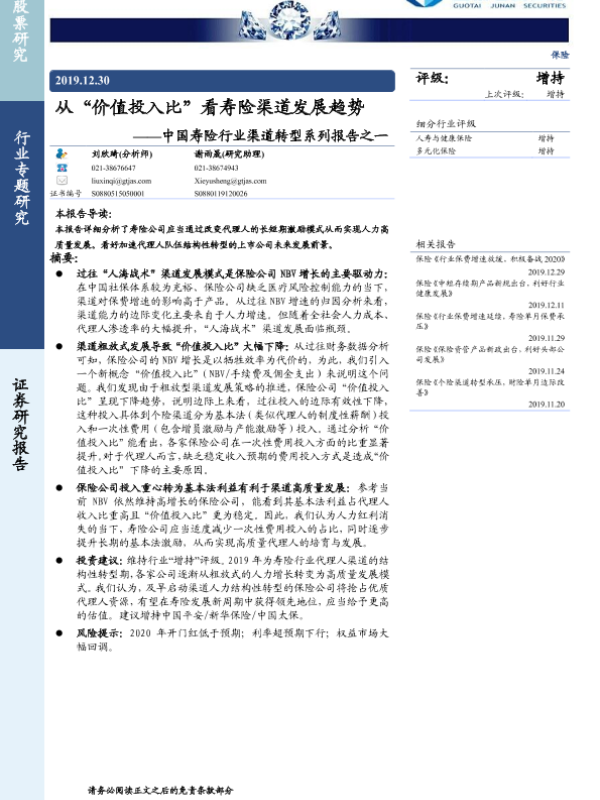 【国泰君安证券】【20191230】从“价值投入比”看寿险渠道发展趋势-19页