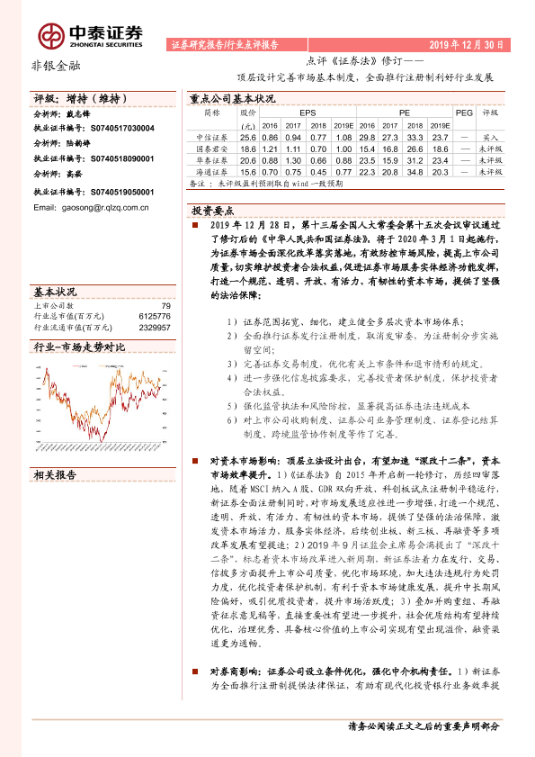 【中泰证券】【20191230】非银金融点评《证券法》修订:顶层设计完善市场基本制度,全面推行注册制利好行业发展-6页