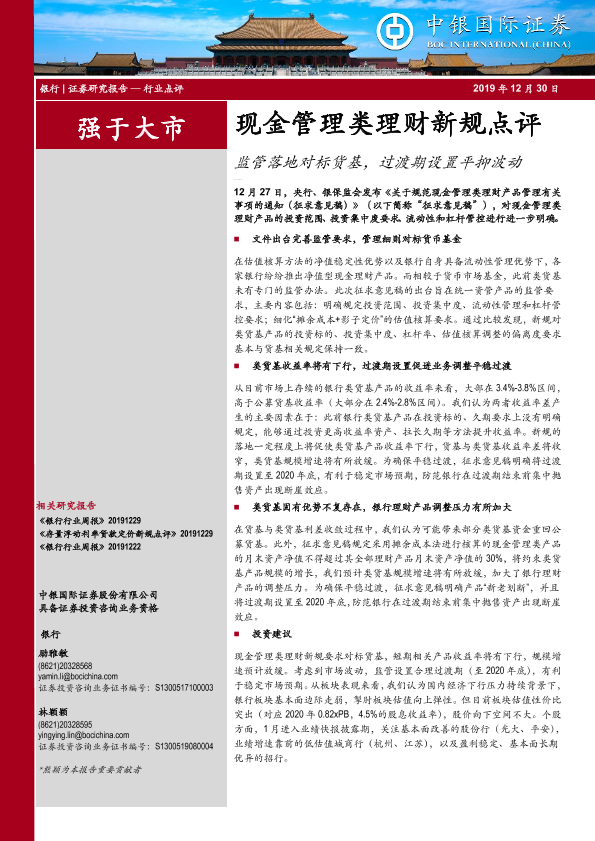 【中银证券】【20191230】现金管理类理财新规点评:监管落地对标货基,过渡期设置平抑波动-6页