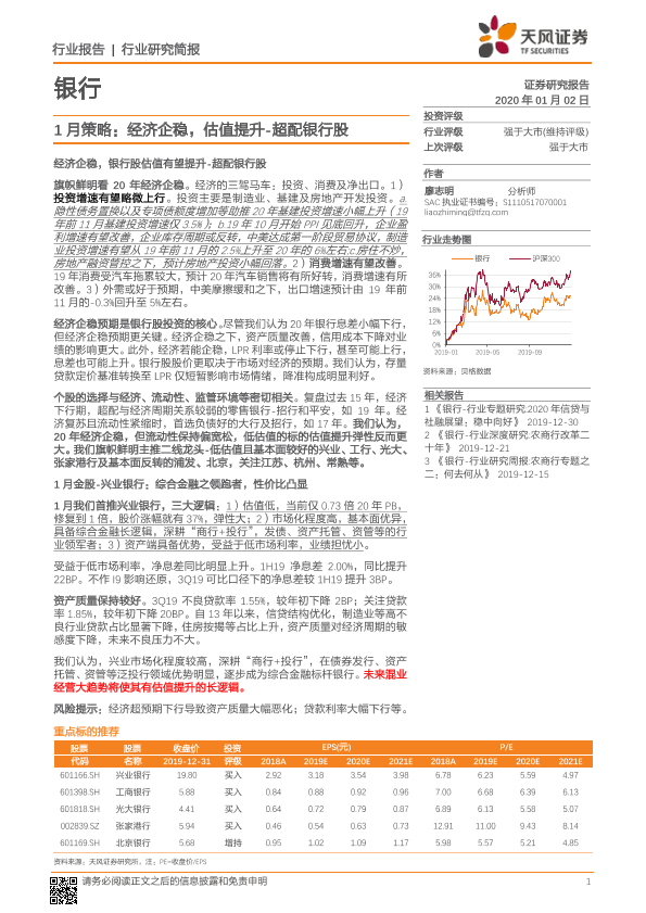 【天风证券】【20200102】1月策略:经济企稳,估值提升-超配银行股-6页
