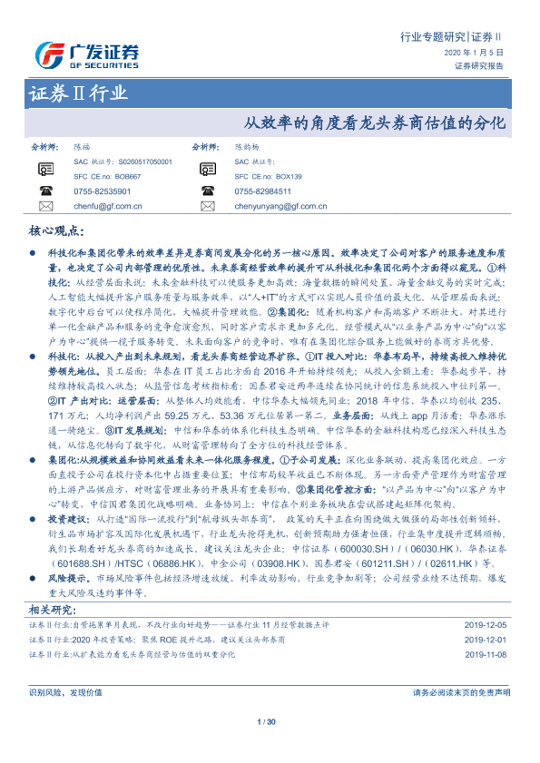 【广发证券】【20200105】从效率的角度看龙头券商估值的分化-30页