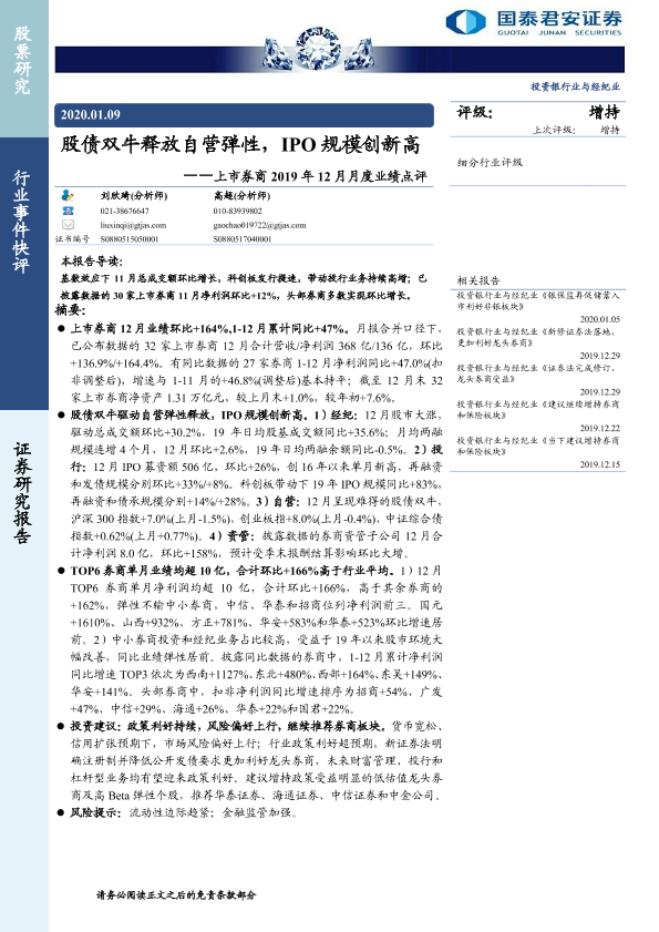【国泰君安证券】【20200109】上市券商2019年12月月度业绩点评:股债双牛释放自营弹性,IPO规模创新高-5页