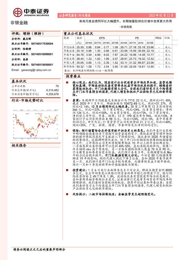 【中泰证券】【20200112】非银周报:券商月度业绩同环比大幅提升,长期储蓄险将在价值中发挥更大作用-12页