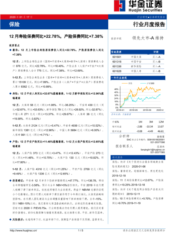 【华金证券】【20200117】12月寿险保费同比+22.78%,产险保费同比+7.38%-5页