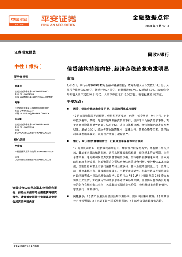 【平安证券】【20200117】金融数据点评:信贷结构持续向好,经济企稳迹象愈发明显-6页