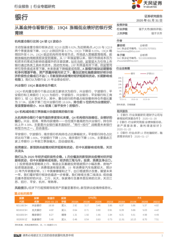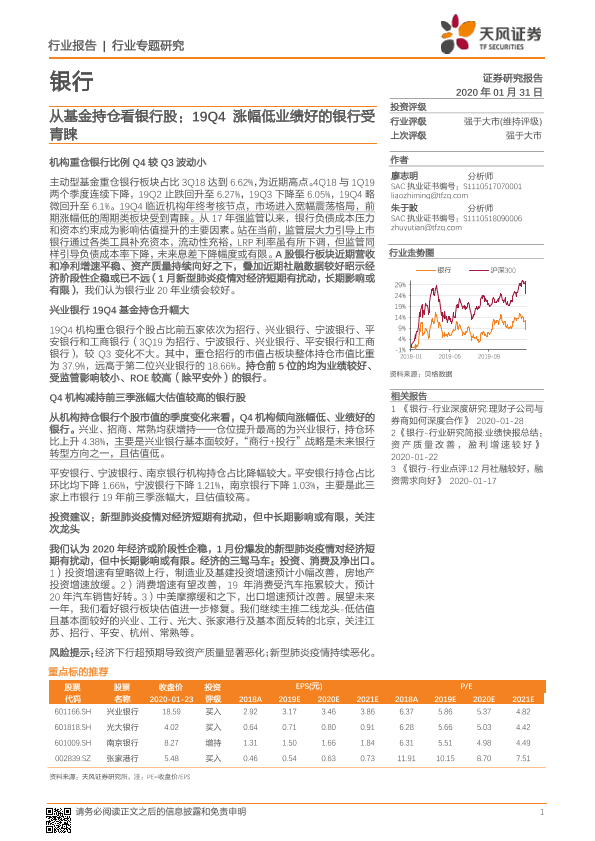 【天风证券】【20200131】从基金持仓看银行股:19Q4涨幅低业绩好的银行受青睐-10页