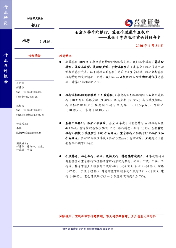 【兴业证券】【20200131】基金本季平配银行,重仓个股集中度提升——基金4季度银行重仓持股分析-7页