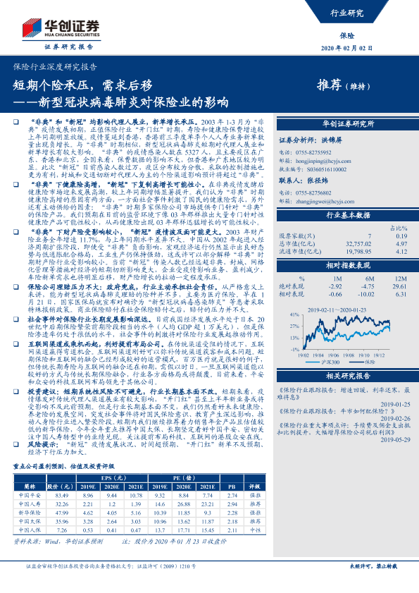 【华创证券】【20200202】保险行业深度研究报告:新型冠状病毒肺炎对保险业的影响——短期个险承压,需求后移-13页