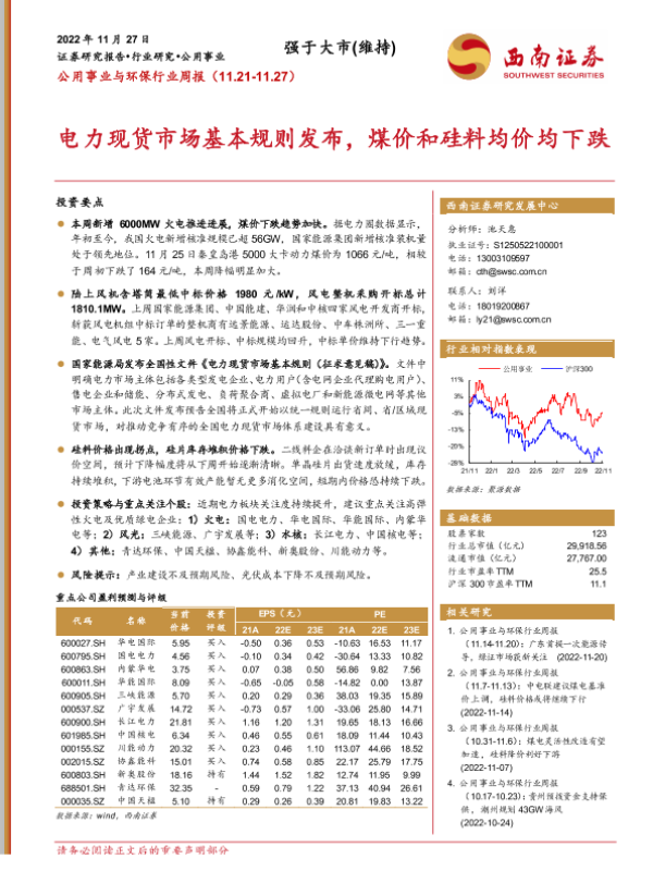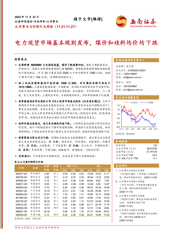 【西南证券】【20221127】公用事业与环保行业周报:电力现货市场基本规则发布,煤价和硅料均价均下跌-25页