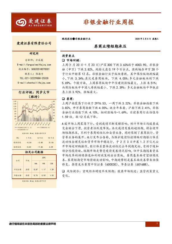 【爱建证券】【20200205】非银金融行业周报:券商业绩短期承压-11页