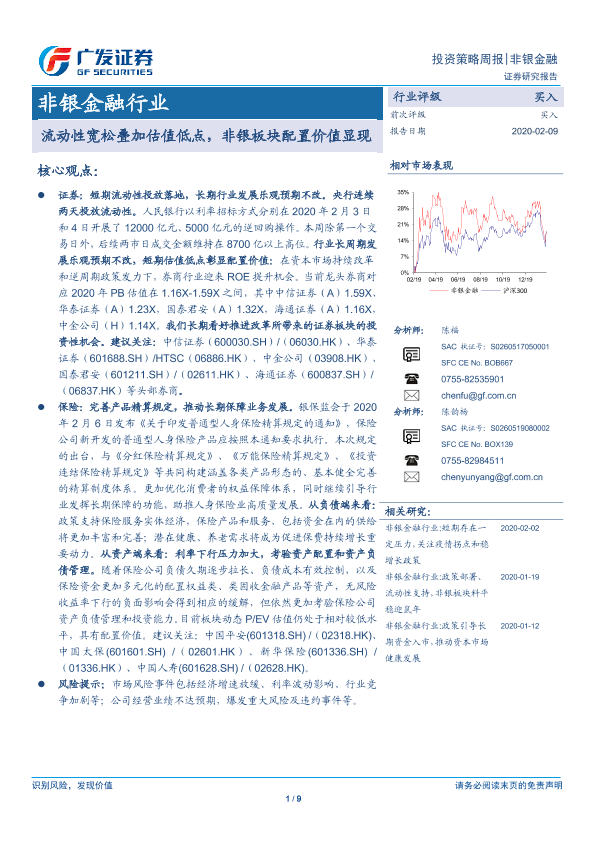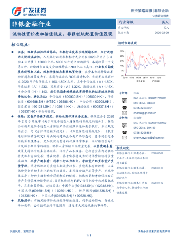 【广发证券】【20200209】非银金融行业投资策略周报:流动性宽松叠加估值低点,非银板块配置价值显现-9页