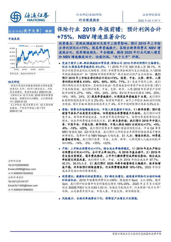 【海通证券】【20200207】保险行业2019年报前瞻:预计利润合计+75%,NBV增速显著分化-20页