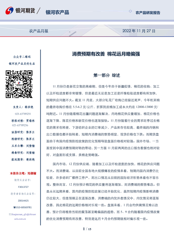 【银河期货】【20221127】农产品月报:消费预期有改善,棉花远月略偏强-15页