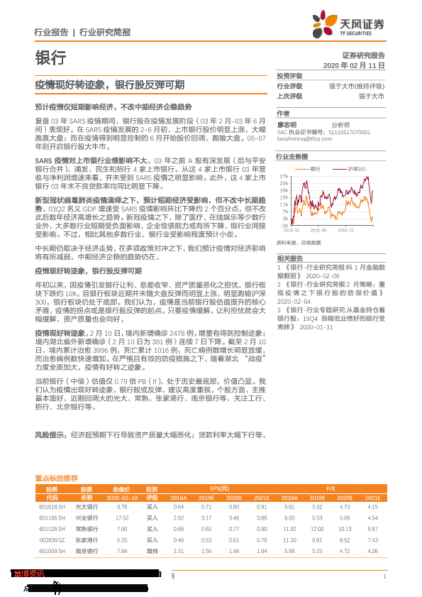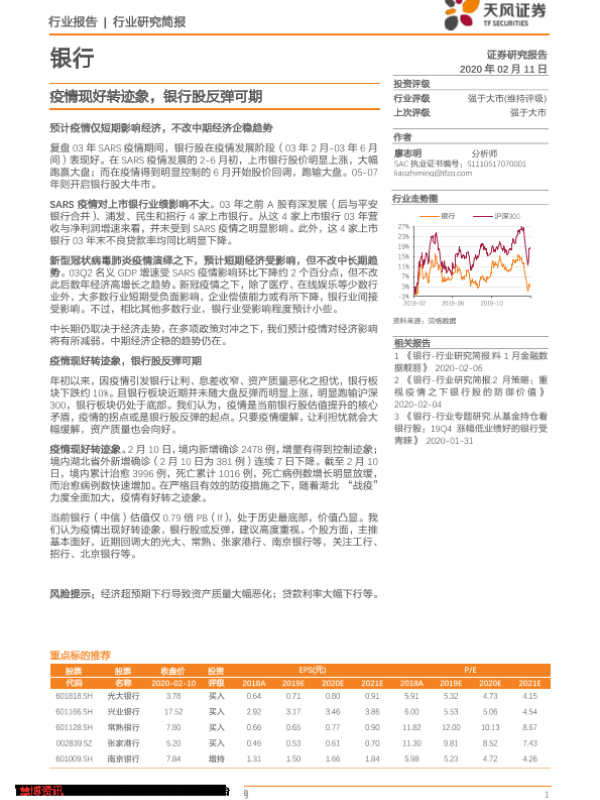 【天风证券】【20200211】银行行业研究简报:疫情现好转迹象,银行股反弹可期-5页