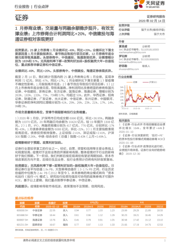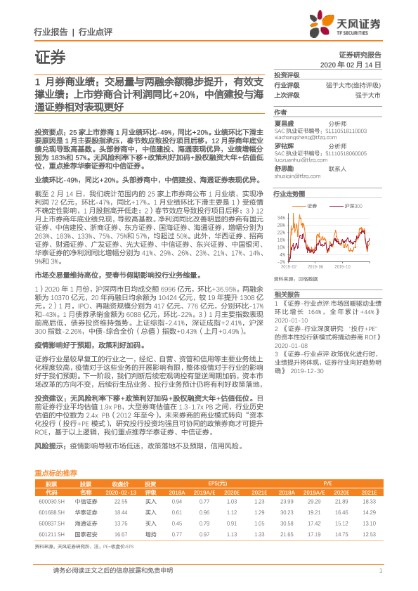 【天风证券】【20200214】1月券商业绩:交易量与两融余额稳步提升,有效支撑业绩-5页