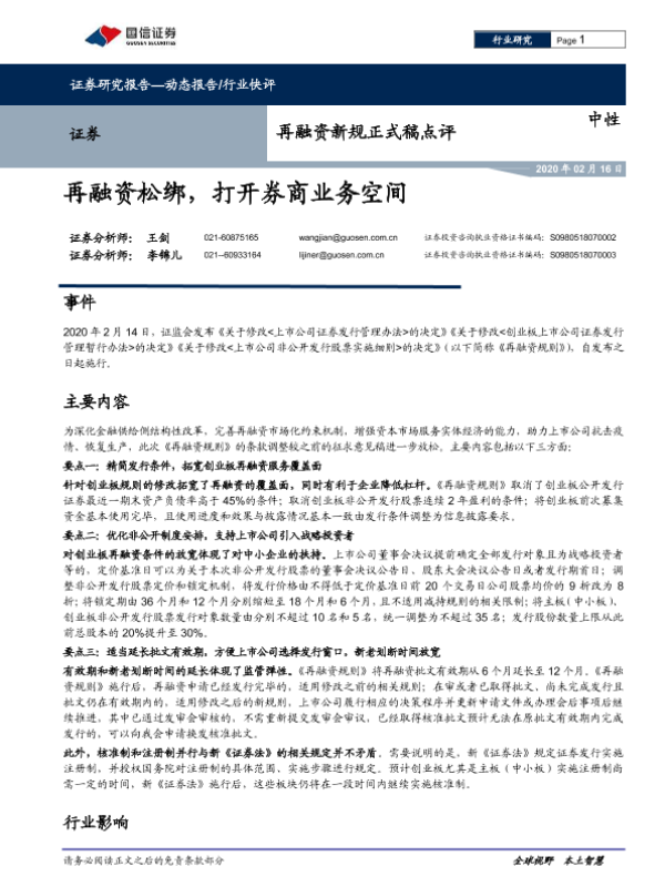 【国信证券】【20200216】证券再融资新规正式稿点评:再融资松绑,打开券商业务空间-5页