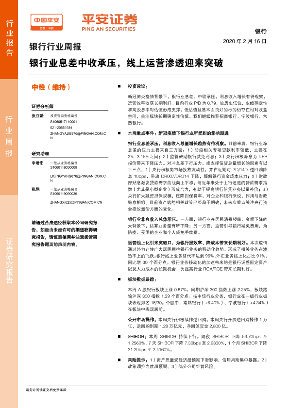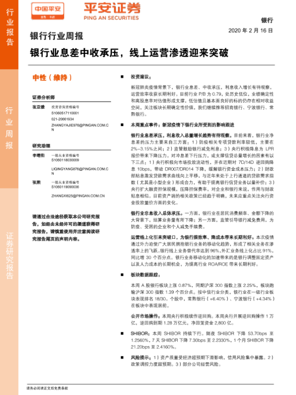 【平安证券】【20200216】银行行业周报:银行业息差中收承压,线上运营渗透迎来突破-7页