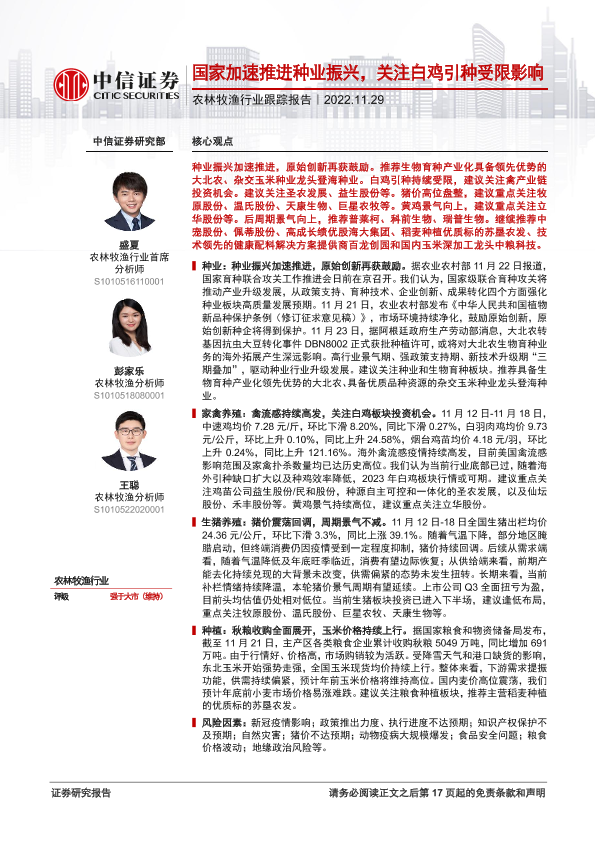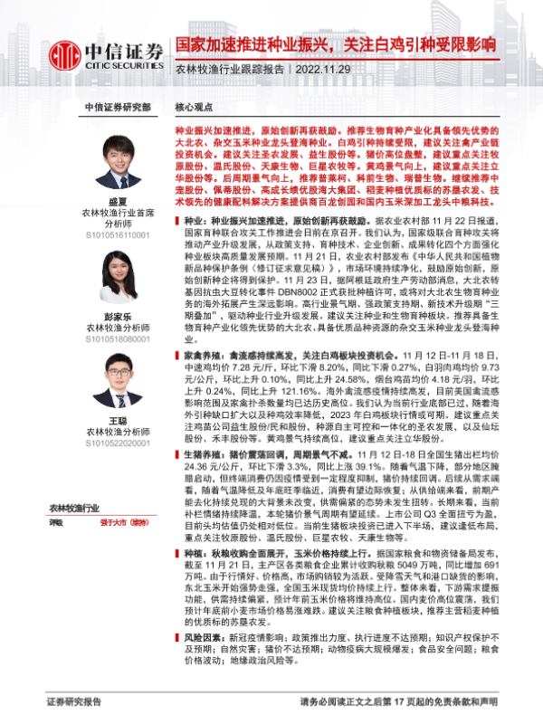 【中信证券】【20221129】农林牧渔行业跟踪报告:国家加速推进种业振兴,关注白鸡引种受限影响-18页
