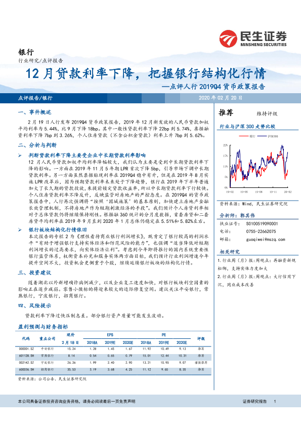 【民生证券】【20200220】点评人行2019Q4货币政策报告:12月贷款利率下降,把握银行结构化行情-3页