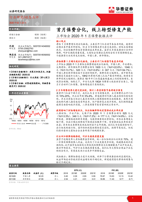 【华泰证券】【20200223】上市险企2020年1月保费数据点评:首月保费分化,线上转型修复产能-3页