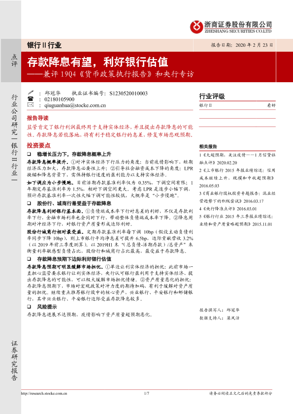 【浙商证券】【20200223】银行Ⅱ行业:兼评19Q4《货币政策执行报告》和央行专访-存款降息有望,利好银行估值-7页