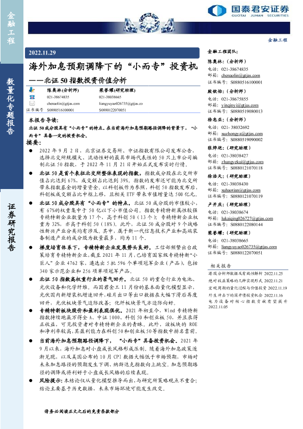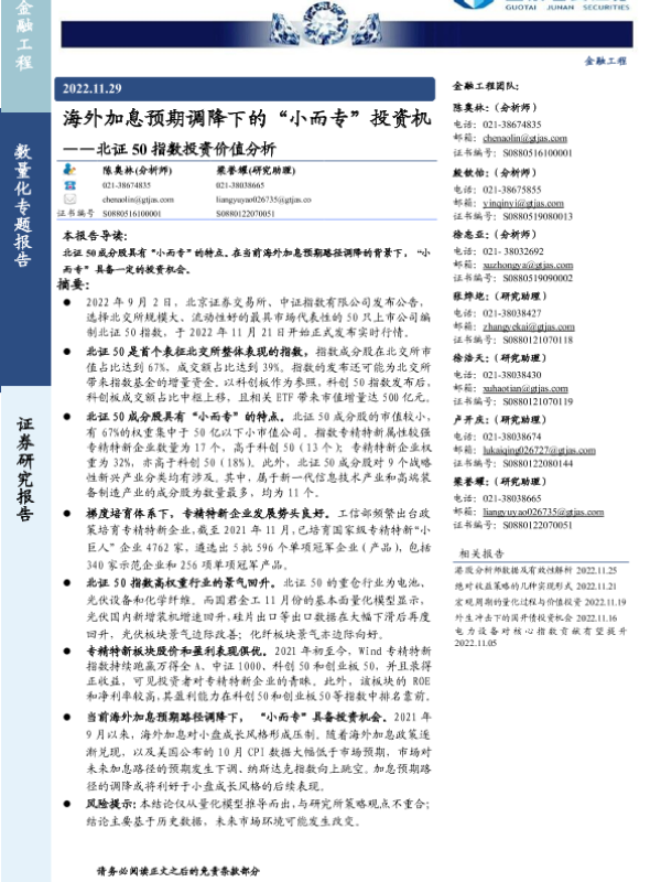【国泰君安证券】【20221129】北证50指数投资价值分析:海外加息预期调降下的“小而专”投资机会-17页
