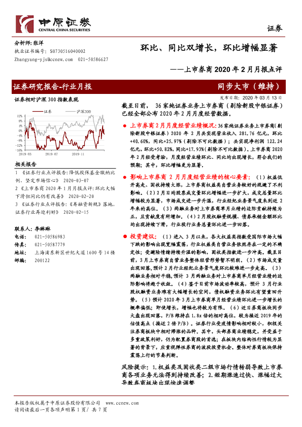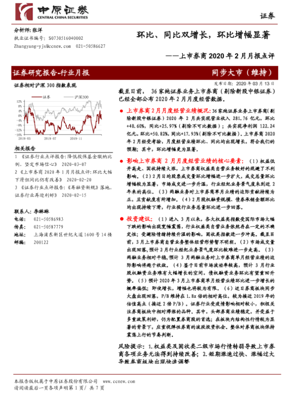 【中原证券】【20200313】上市券商2020年2月月报点评:环比、同比双增长,环比增幅显著-7页