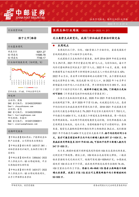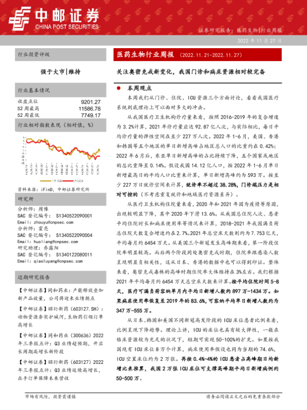 【中邮证券】【20221127】医药生物行业周报:关注奥密克戎新变化,我国门诊和病床资源相对较完备-22页