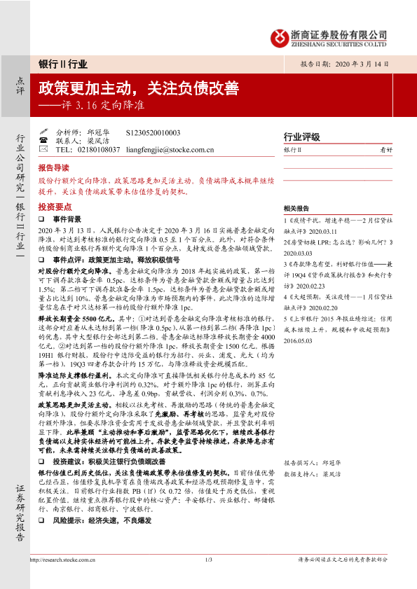 【浙商证券】【20200314】银行Ⅱ行业评3.16定向降准:政策更加主动,关注负债改善-3页