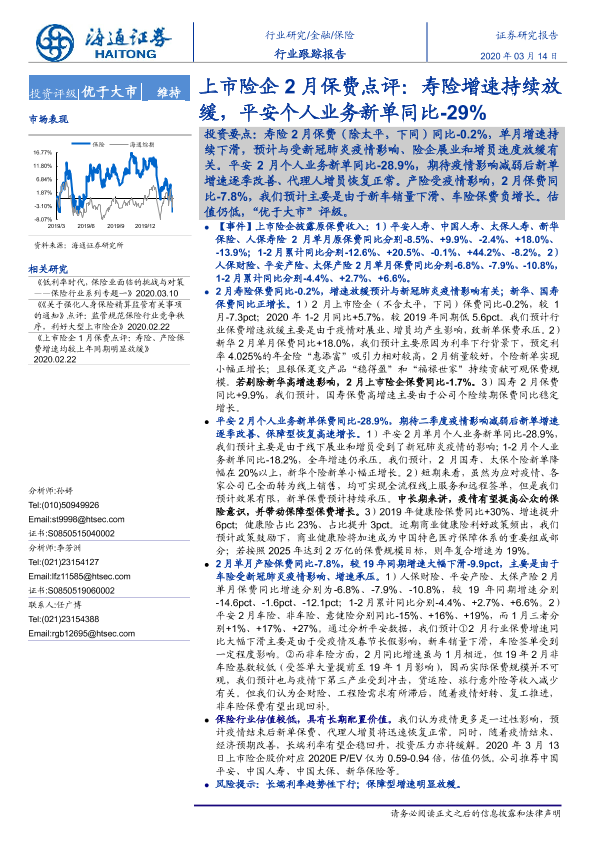 【海通证券】【20200314】上市险企2月保费点评:寿险增速持续放缓,平安个人业务新单同比-29%-6页