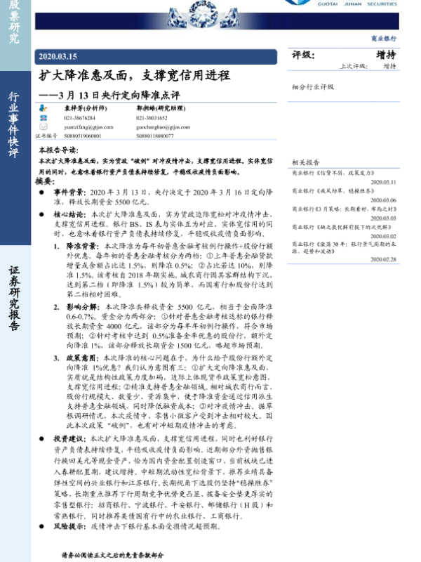 【国泰君安证券】【20200315】3月13日央行定向降准点评:扩大降准惠及面,支撑宽信用进程-3页